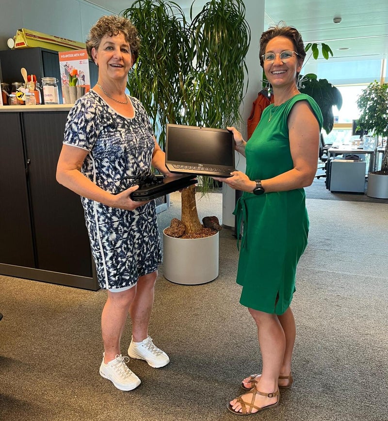 11 juli 2023 Overhandiging van 3 laptops. Een schenking van bedrijf NXP door Lisette Cornelissen (R) via Samen voor Eindhoven