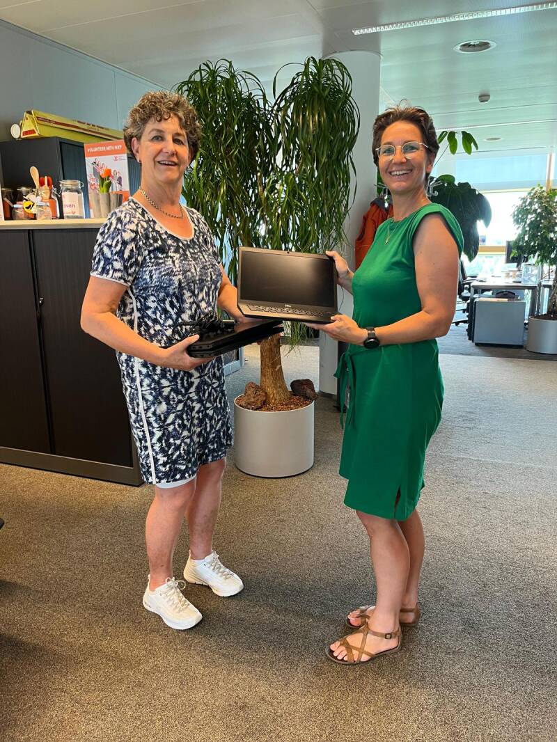 July 11-2023 Donation of three laptops. A gift from NXP, presented by Lisette Cornelissen (R) via Samen voor Eindhoven (Together for Eindhoven)